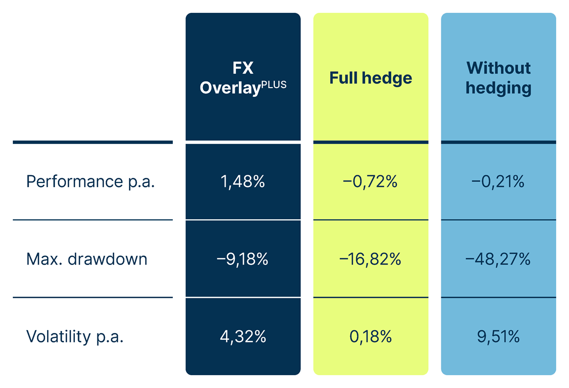 The FX OverlayPLUS would have contributed a positive annual performance of 1.48 percent to the portfolio between 2000 and October 2023, while full hedging would have incurred annual costs of 0.72 percent. An unhedged US dollar portfolio would have suffered annual currency losses of 0.21 percent over the same period. The risk parameters compared to an unhedged portfolio are also favourable: With FX OverlayPLUS, the volatility in the observation period decreased by 55 percent and the maximum drawdown by 81 percent (see table).