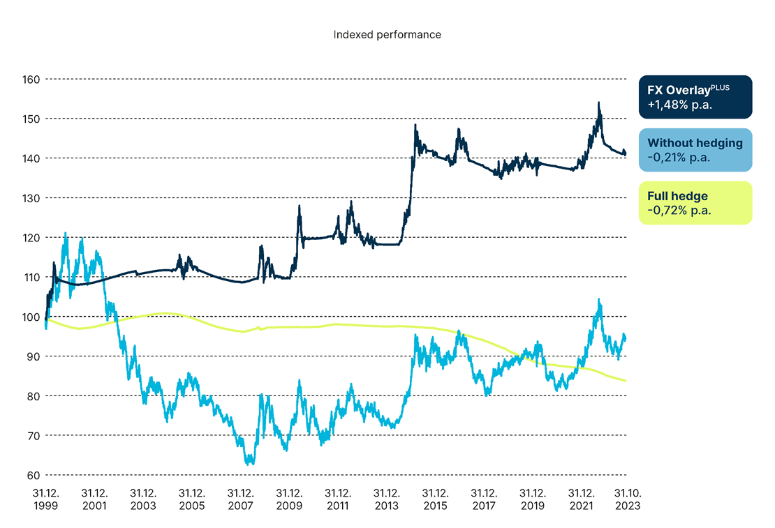 Currency hedging becomes increasingly important for investors in volatile times – but full hedging incurs costs. Our FX OverlayPLUS, on the other hand, can help improve performance.