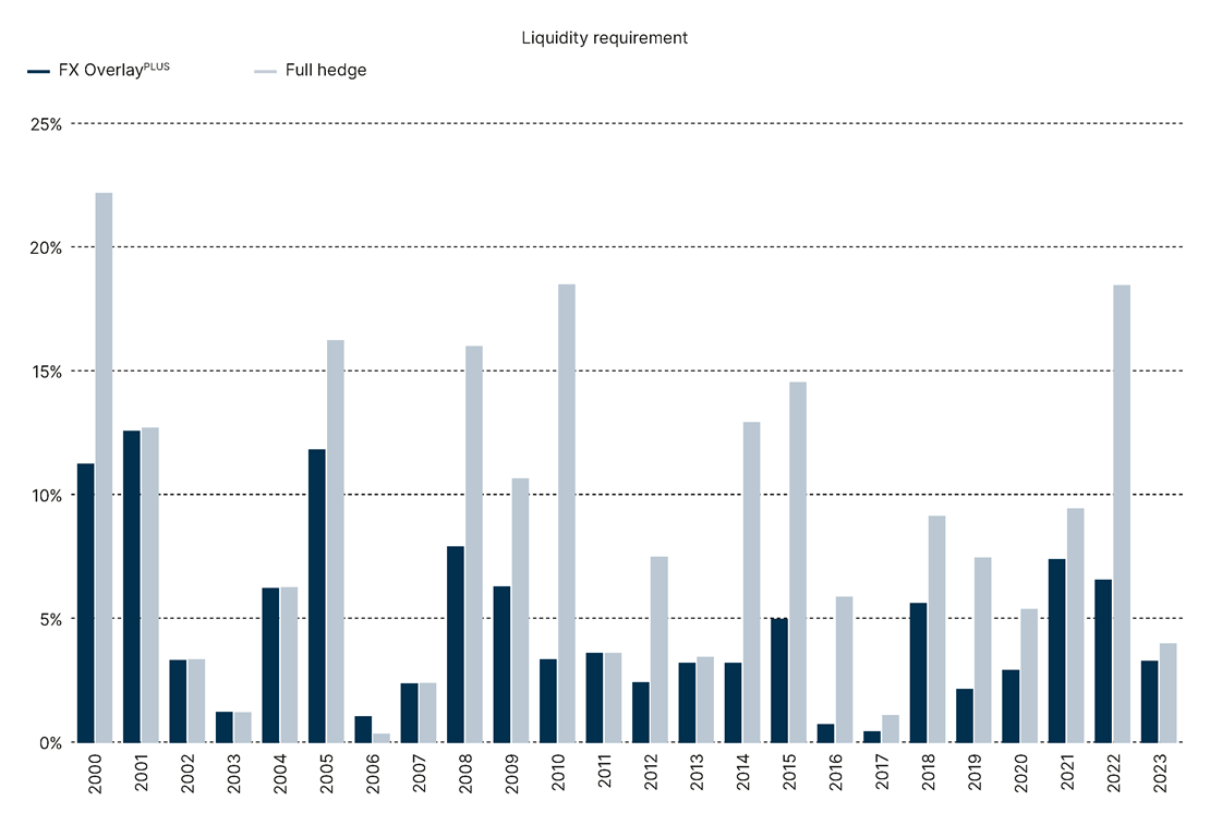 Compared to traditional full hedging, our dynamic FX OverlayPLUS can significantly reduce liquidity requirements and carry costs for currency hedging.