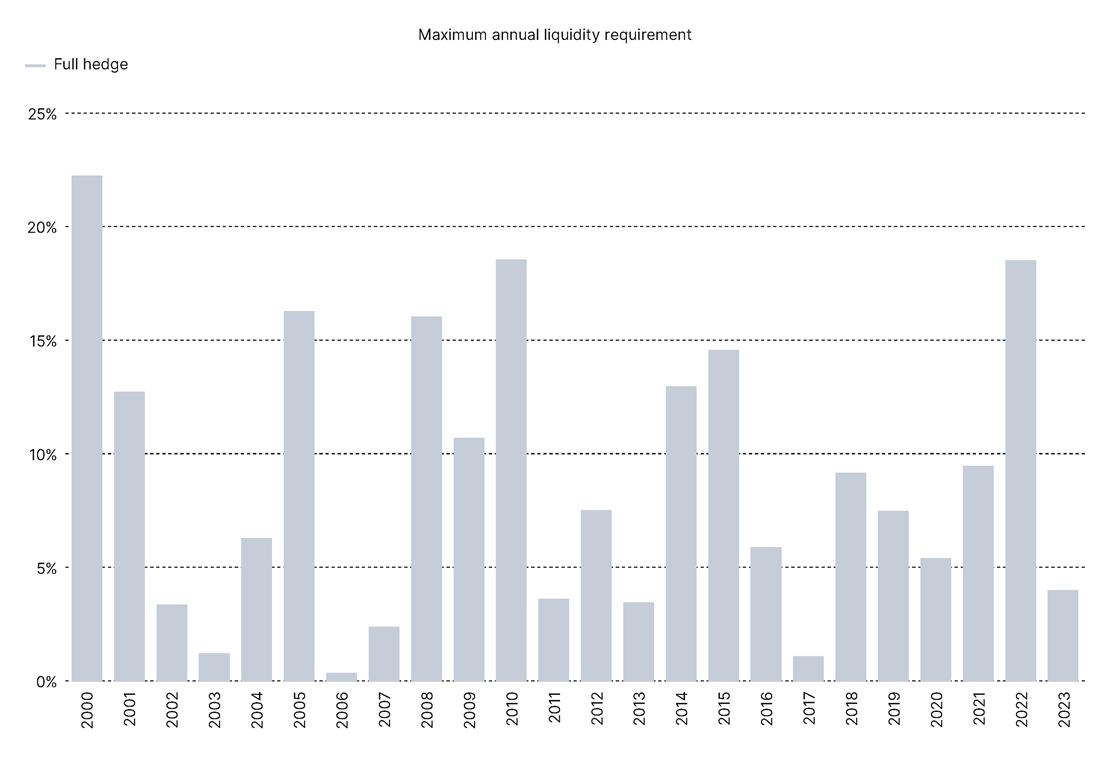 As desirable as it is, currency hedging does not come for free. Especially in highly volatile markets, there can be significant liquidity requirements if full hedging requires a substantial margin deposit. In the year 2022, a peak of 19 percent was recorded for hedging a US dollar exposure in euros. As this meant that investors needed to deposit almost 20 percent of assets as liquid collateral, the opportunity costs for a fully hedging FX overlay were notably high.