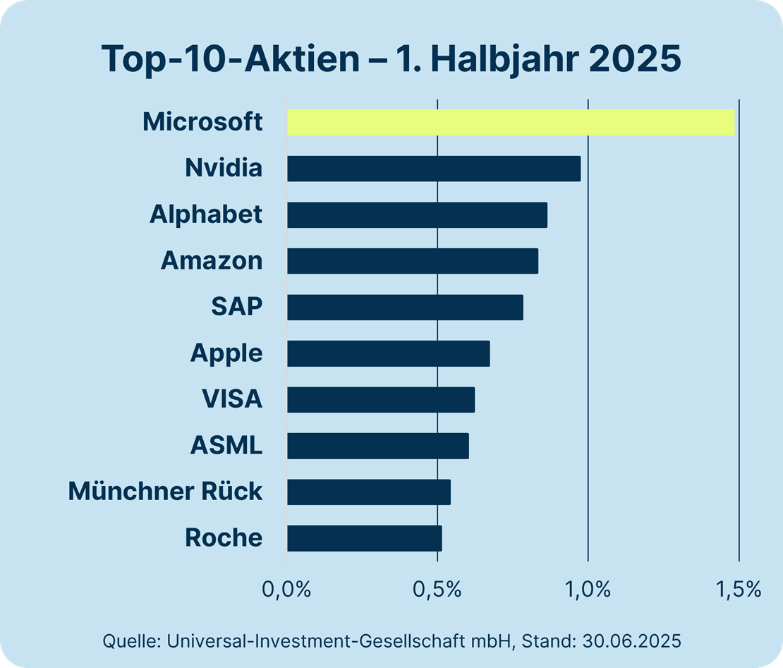 Sechs der zehn größten Aktien sind US-amerikanisch; mit SAP und Münchner Rückversicherung sind aber immerhin zwei deutsche Titel unter den Top 10. Während Berkshire Hathaway im Vergleich zu Ende 2024 aus dem Ranking herausfiel, konnte sich die Münchner Rückversicherung neu etablieren.