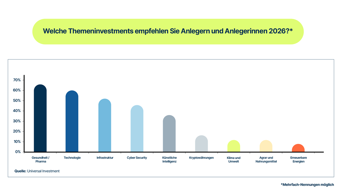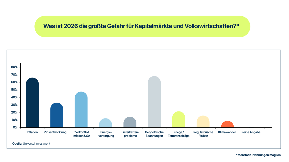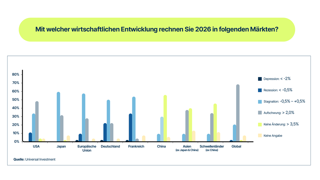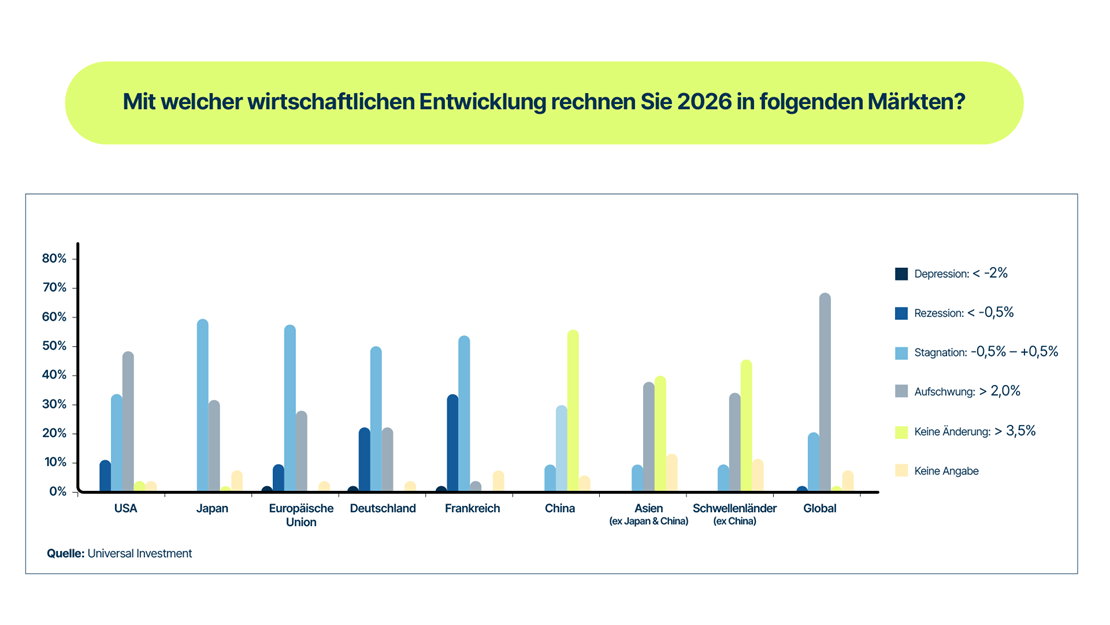 Die Welt wird 2026 einen wirtschaftlichen Aufschwung erleben. Dieser Ansicht sind rund 70% der mehr als 50 Expertinnen und Experten, die an der aktuellen Vermögensverwalter-Umfrage von Universal Investment teilgenommen haben. Einen Aufschwung prognostizieren rund 48% der Befragten auch für die USA, sind aber damit deutlich pessimistischer als im Vorjahr, als noch rund 66% ein solches Szenario erwarteten.
