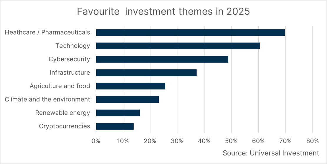 In terms of thematic investments, pharmaceuticals rank highest at 70 per cent, overtaking technology (60 per cent). Cybersecurity (49 per cent) and infrastructure (37 per cent) come in third and fourth, with climate and environment ranking sixth with 23 per cent.
